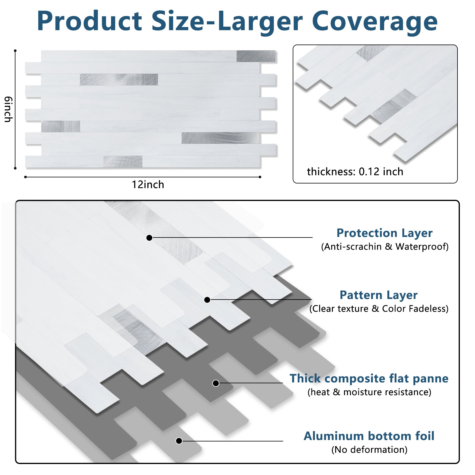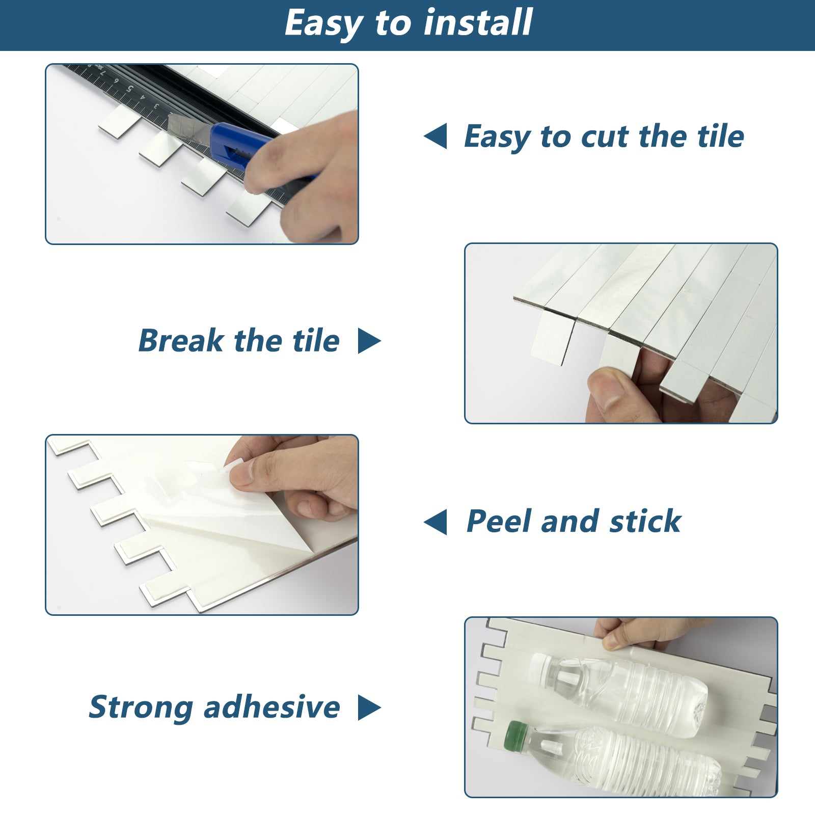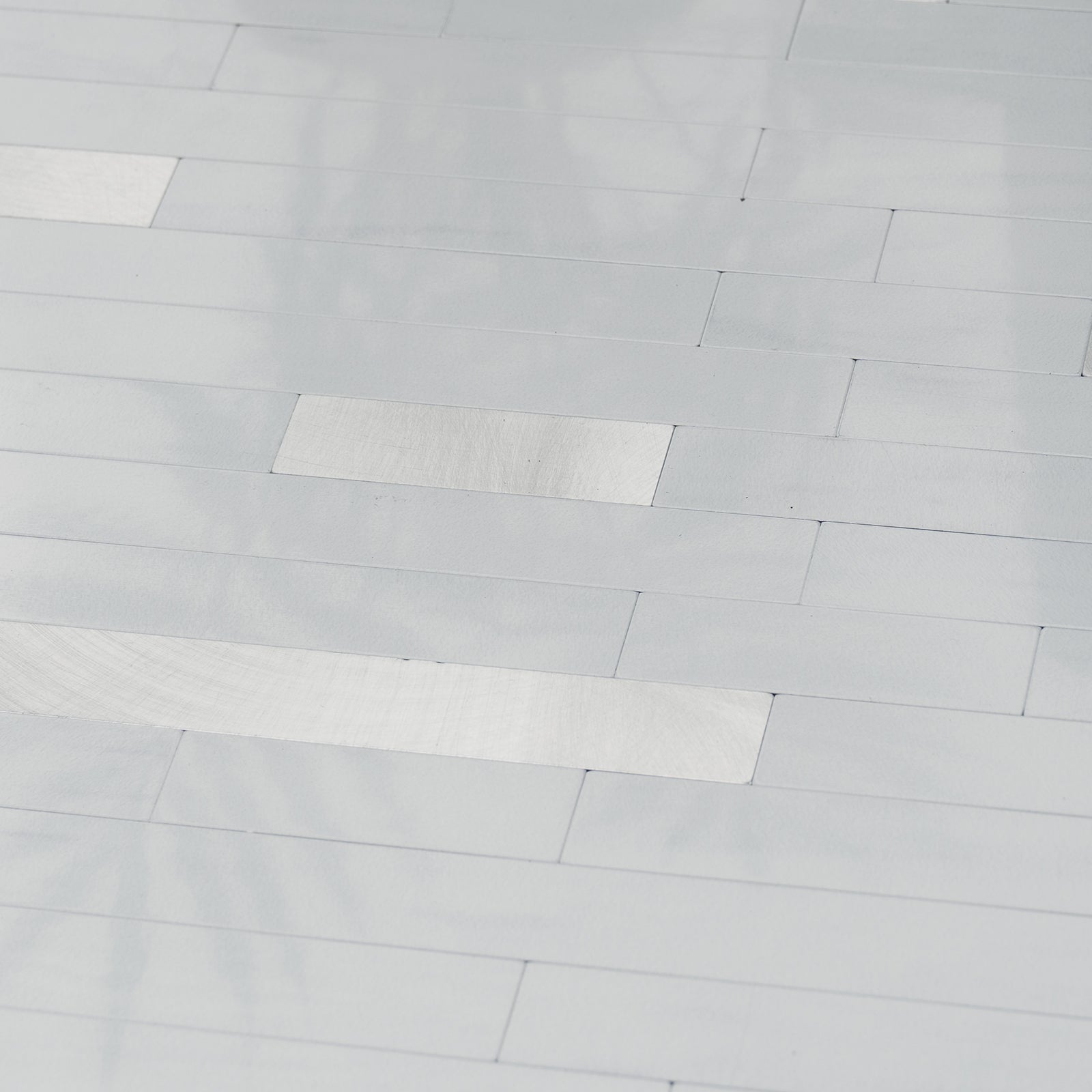 Der Abstand zwischen den einzelnen Fliesen besteht aus 3M-Klebeschaum. Sie können die Fliesen einfach mit einem Universalmesser trennen. Wenn Sie Fliesen schneiden müssen, um eine gerade Kante zu erhalten, verwenden Sie bitte eine gute Industrieschere oder ein Skalpell. Die Rückseite der Fliese besteht aus einer PVC-Verbundschicht, die sich leichter schneiden lässt als die Metalloberfläche.