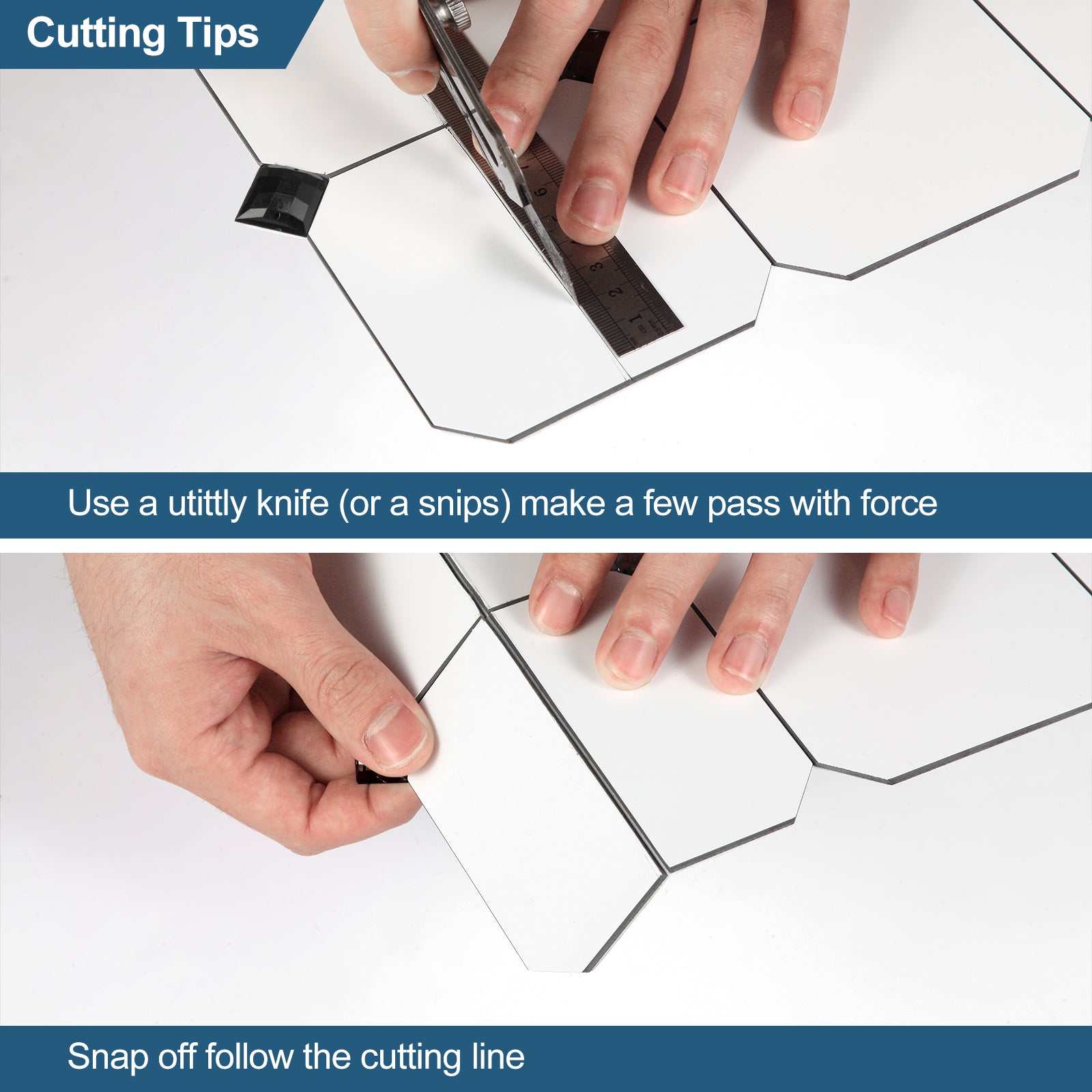 Der Abstand zwischen den einzelnen Fliesen besteht aus 3M-Klebeschaum. Sie können die Fliesen einfach mit einem Universalmesser trennen. Wenn Sie Fliesen schneiden müssen, um eine gerade Kante zu erhalten, verwenden Sie bitte eine gute Industrieschere oder ein Skalpell. Die Rückseite der Fliese besteht aus einer PVC-Verbundschicht, die sich leichter schneiden lässt als die Metalloberfläche.