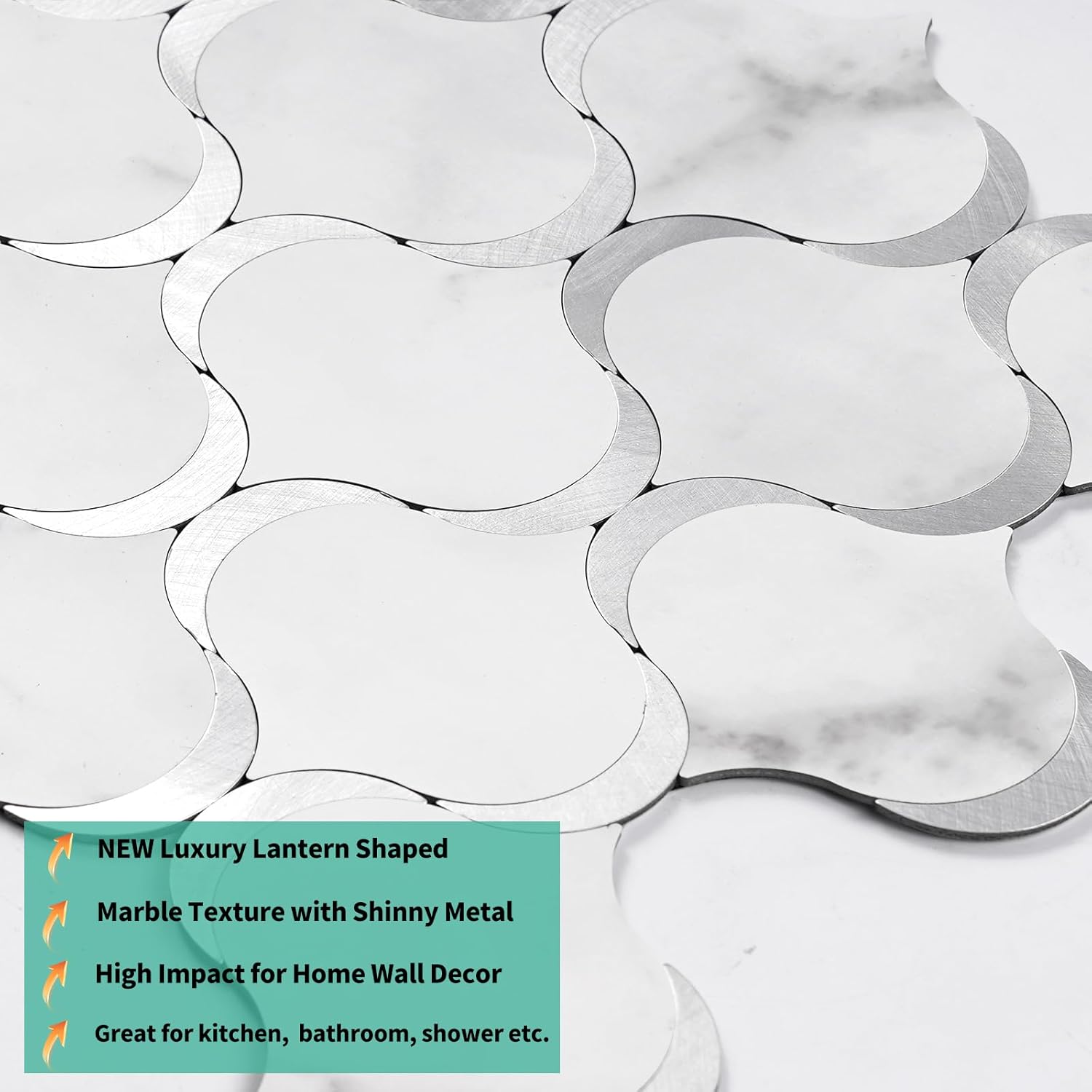 10.6" X 11.3" Marble White With Silver Arabesque Peel and Stick Tile