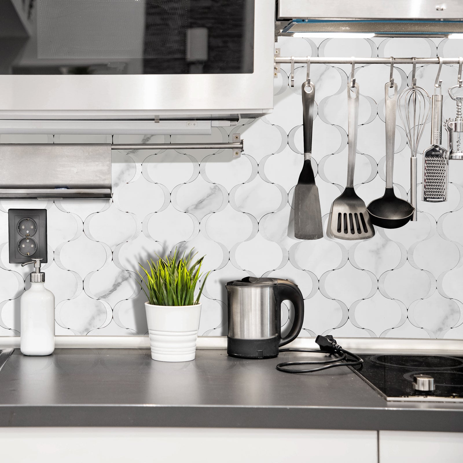 Elevate your walls with the Yipscazo Arabesque Peel and Stick Tile in marble white accented by silver. Crafted from sleek vinyl composition, its bold monochrome design brings a striking edge to any room. Experience flawless style instantly—no grout, no mess, just pure impact.