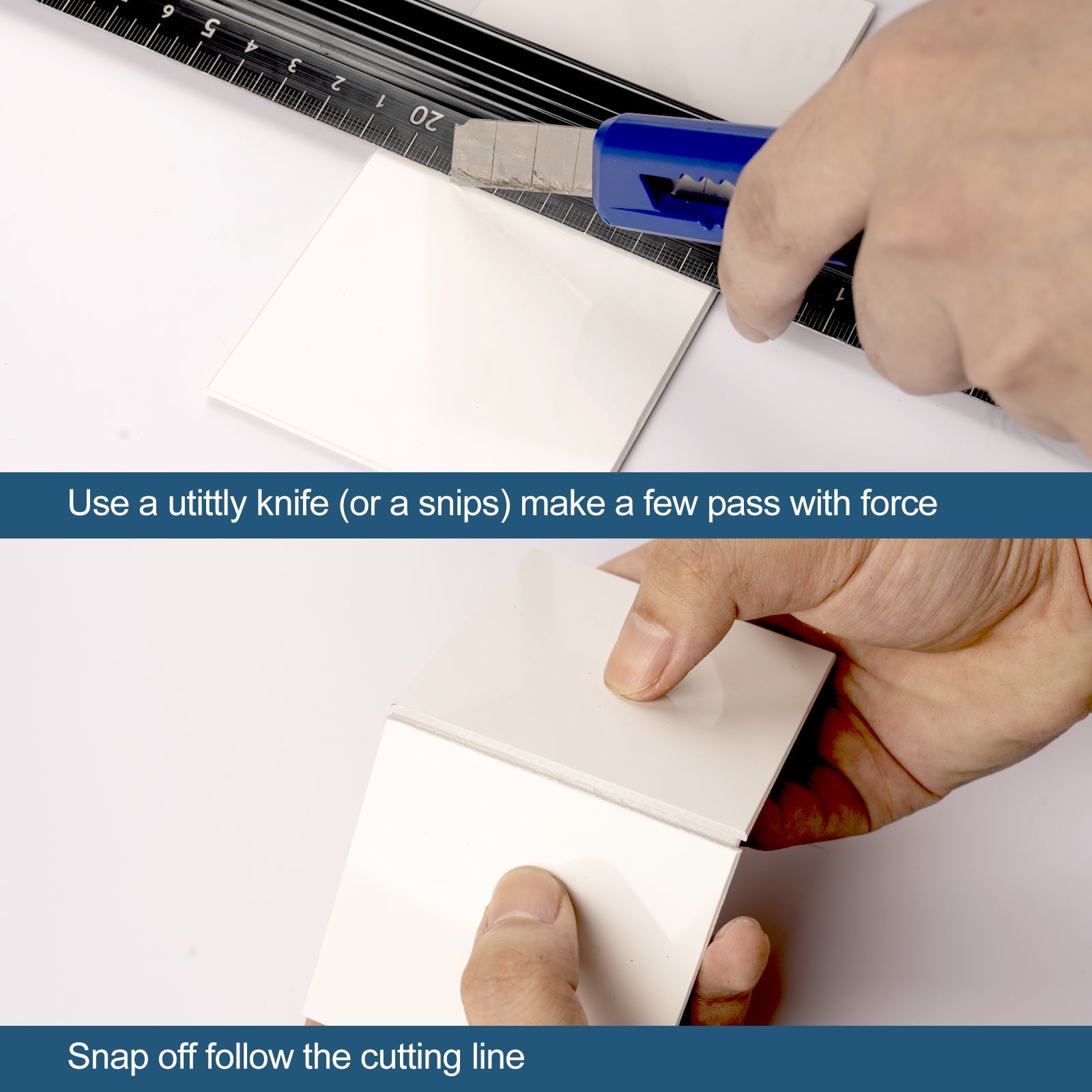 Der Abstand zwischen den einzelnen Fliesen besteht aus 3M-Klebeschaum. Sie können die Fliesen einfach mit einem Universalmesser trennen. Wenn Sie Fliesen schneiden müssen, um eine gerade Kante zu erhalten, verwenden Sie bitte eine gute Industrieschere oder ein Skalpell. Die Rückseite der Fliese besteht aus einer PVC-Verbundschicht, die sich leichter schneiden lässt als die Metalloberfläche.