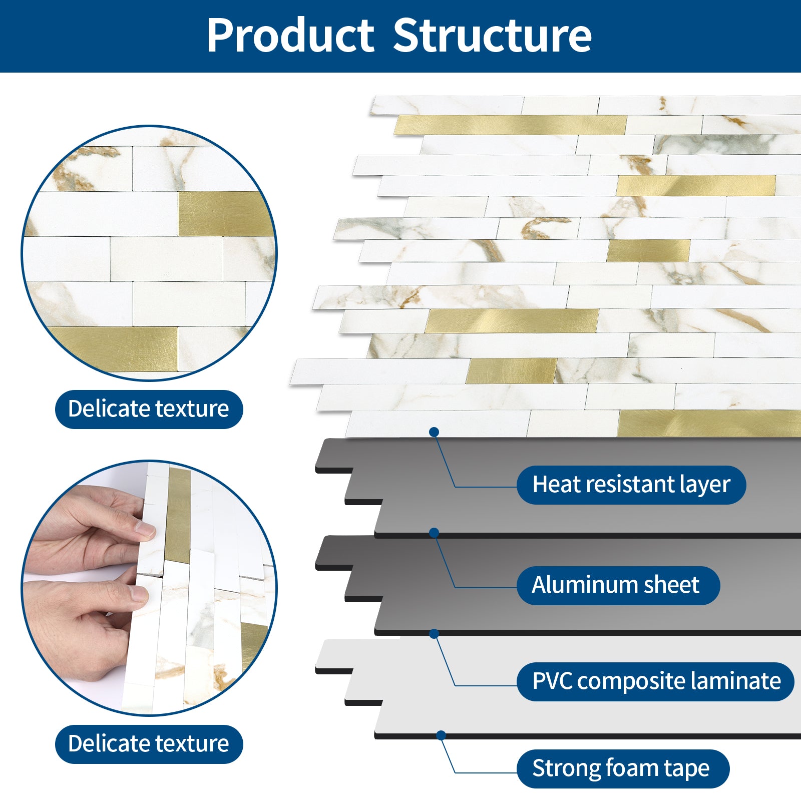 Die Oberfläche besteht aus echter Textur und Metallfolie, nicht aus 3D-Gel. Sie verfärbt sich nicht und lässt sich leicht abwischen, um Flecken zu entfernen. Spritzer sind kein Problem. Es ist absolut widerstandsfähig gegen den Einsatz in einer echten Küche und einem Badezimmer.