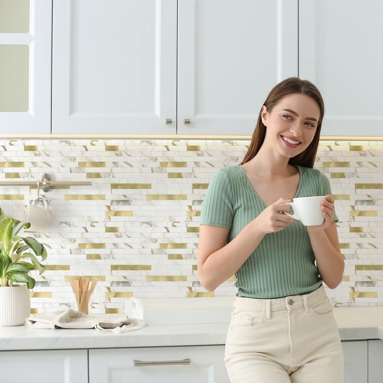 Unsere innovative selbstklebende Küchenrückwand mit rustikalen und metallischen Elementen veredelt Ihre Küche. Verleihen Sie Ihrem Raum mit der selbstklebenden Küchenrückwand ganz einfach einen Hauch eleganter Marmorfliesen und goldener Akzente. Verbessern Sie Ihre Designfähigkeiten und erfrischen Sie Ihr kulinarisches Paradies im Handumdrehen!